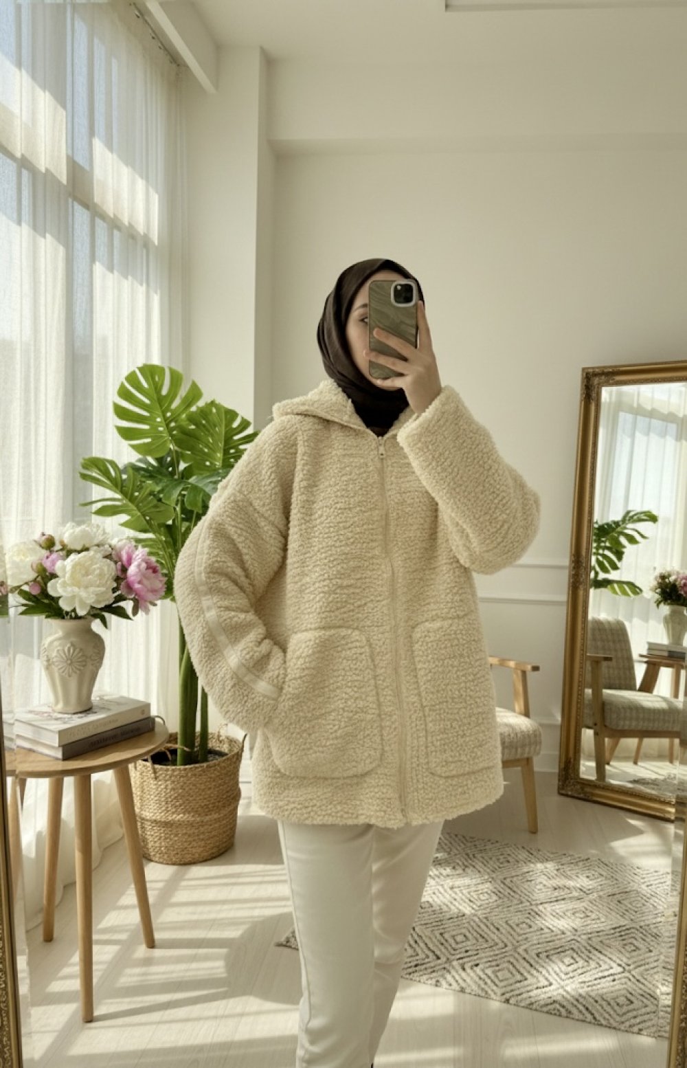 Fermuarlı peluş mont Krem