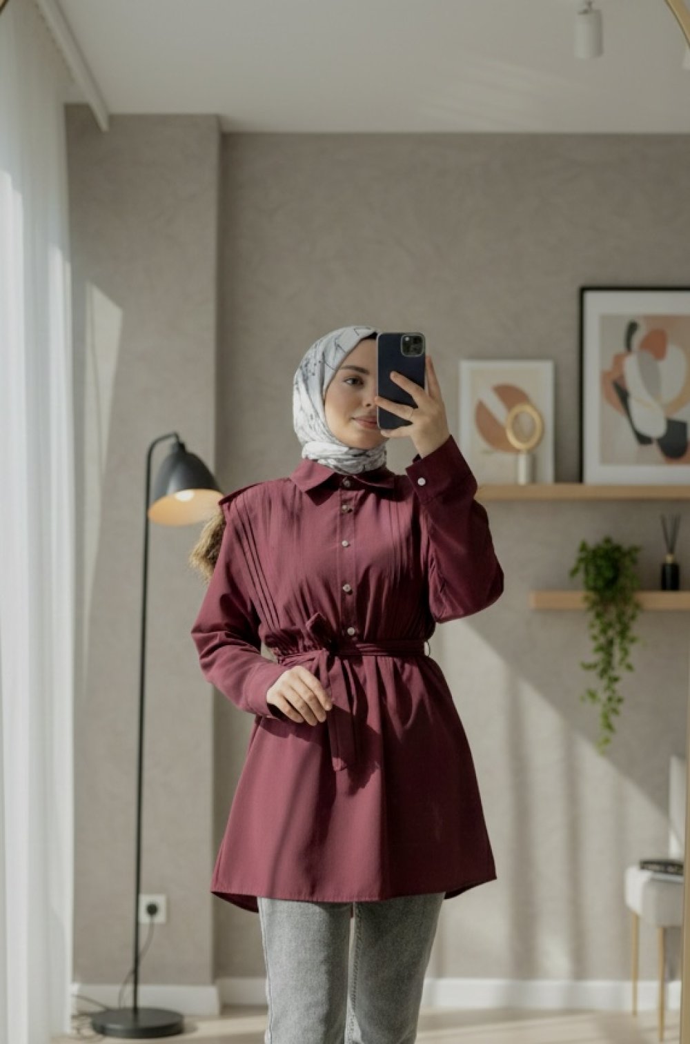 Nervürlü belden bağlamalı gömlek Bordo